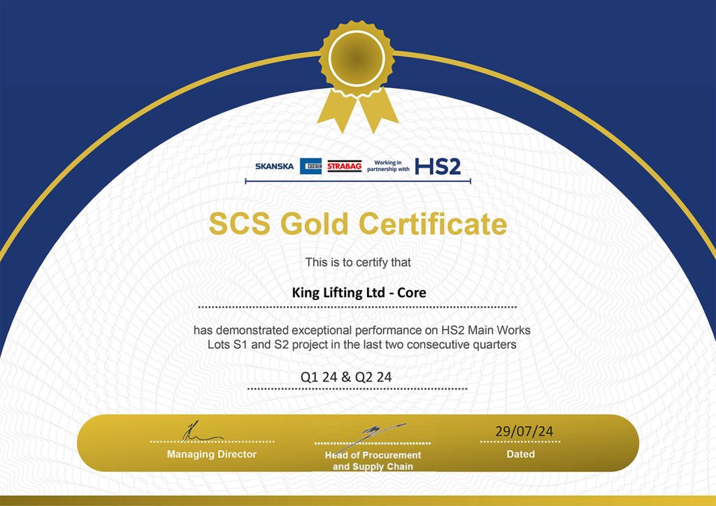 View detailsKing Lifting awarded SCS Gold Certificate for exceptional performance on the HS2 projects
